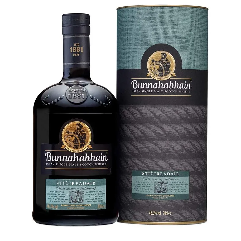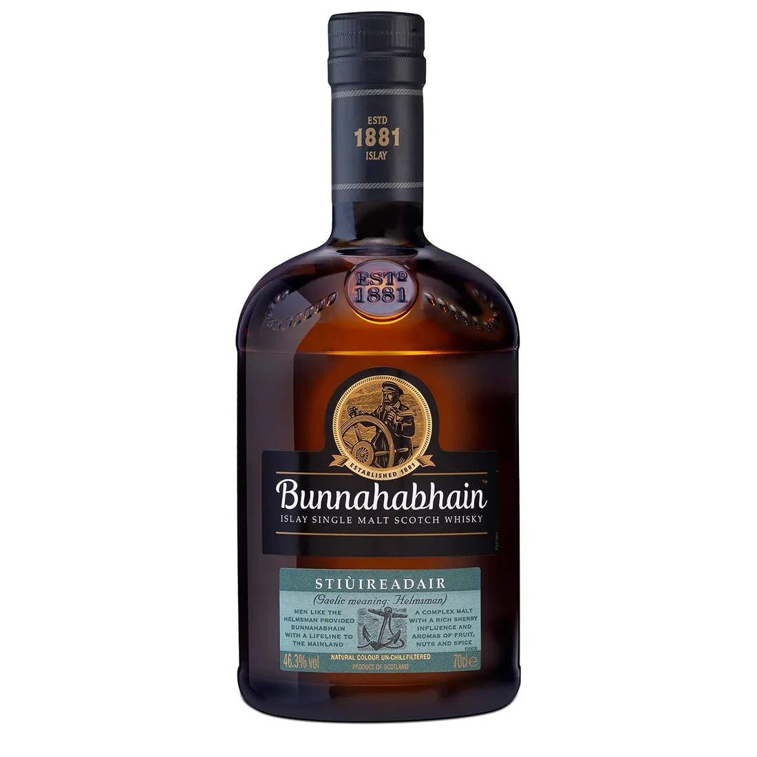 Discover a different side of Islay with Bunnahabhain Stiùireadair, a bold and coastal Islay Single Malt Whisky that defies the region's smoky reputation. Pronounced ‘stew-rahdur’ (Scots Gaelic for ‘helmsman’), this release pays homage to the Bunnahabhain Helmsman who graces every bottle, guiding the distillery through the rugged waters of the Sound of Islay.