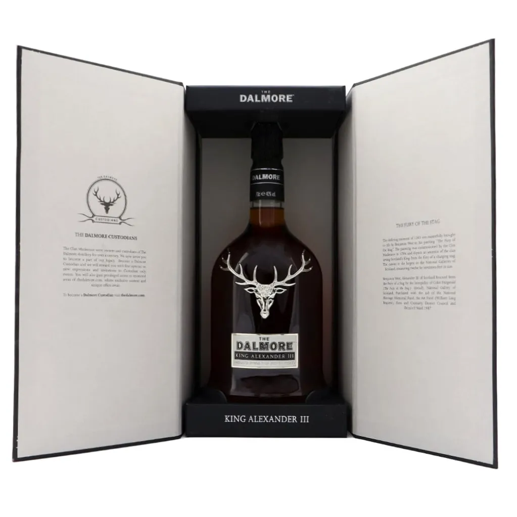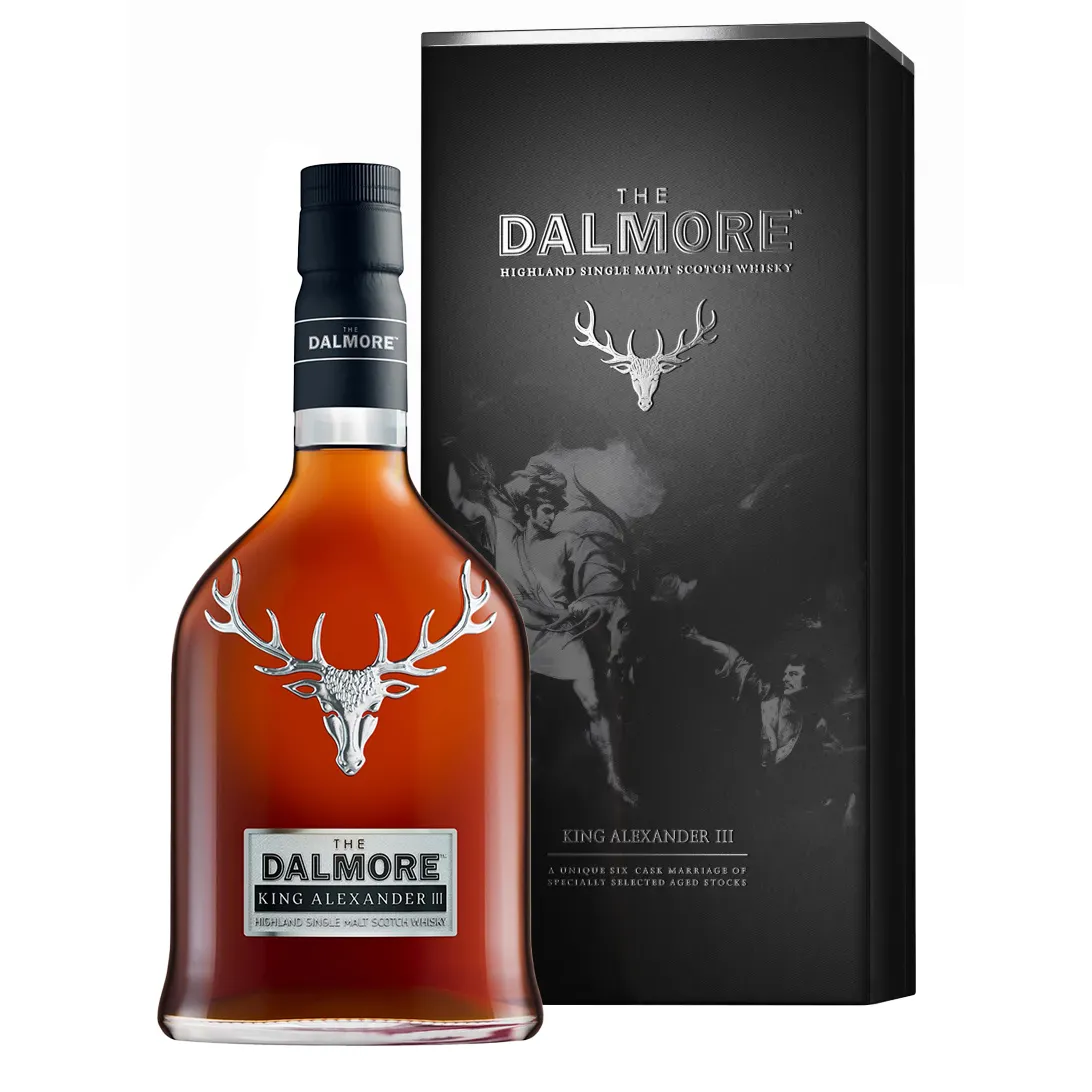 King Alexander III from Dalmore was crafted to honour the act of saving Scotland's King in 1263. It has been matured in a unique combination of six casks: small batch Bourbon casks, Matusalem Oloroso Sherry casks, Madeira casks, Marsala casks, Port pipes and Cabernet Sauvignon wine barriques.