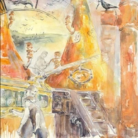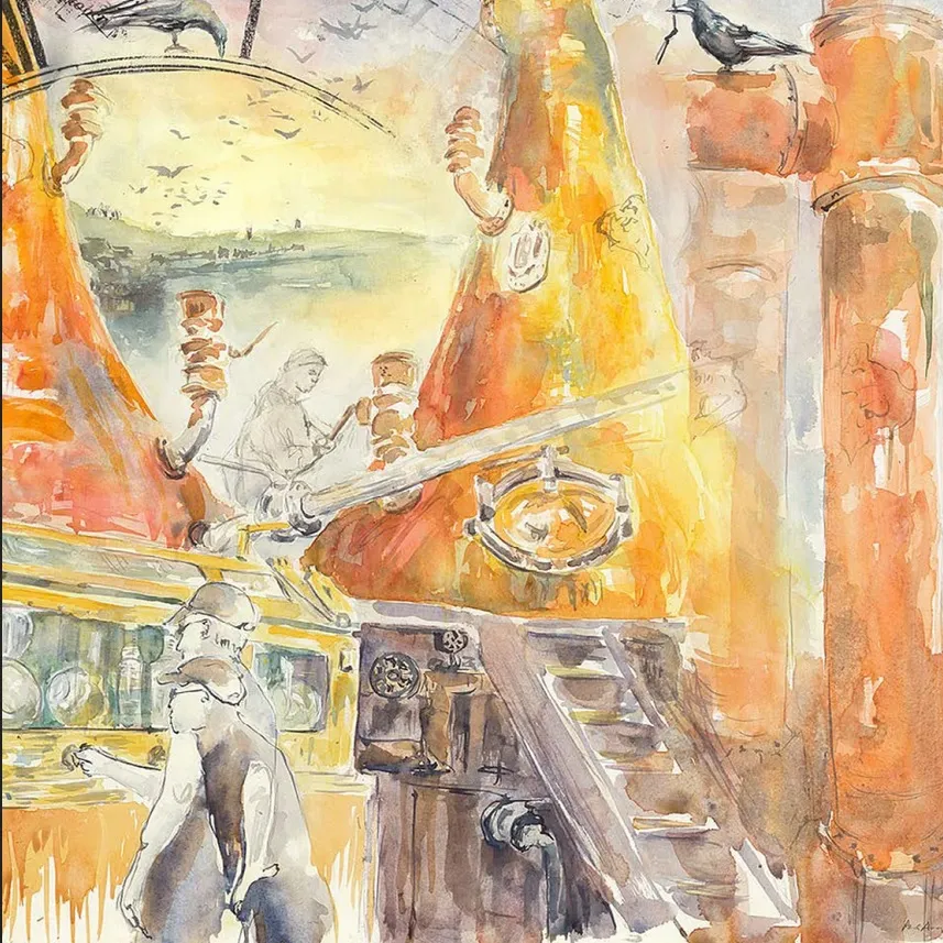 "Even in cold winter days the still room is hot. I often sat close to the stills to draw them and felt like the whole space was filled with a fiery orange glow and heat. The room is full of sounds, from the creak of the stills, the deep musical clangof the man-door opening, and the hiss of the steam escaping. The stillman constantly checks, adjusts, and waits for just the right moment. When the spirit is ready its aroma escapes the spirit safe and fills the room. When I went outside to cool down, the rooks and hooded crows of Campbeltown hopped about on the warehouse roof, and sometimes I could smell the crash of waves on the wind as it drifted through the courtyard.” Alice Angus for Heart of the Run Edition