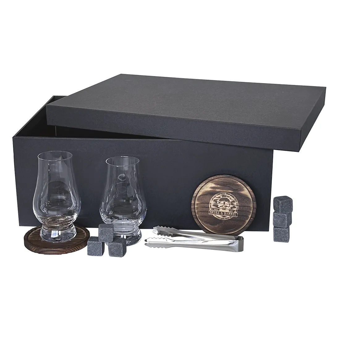 Glen Scotia Victoriana with gift box including 2 glasses, 2 wooden coasters with Skull & Barrel logo and 6 stone ice cubes.