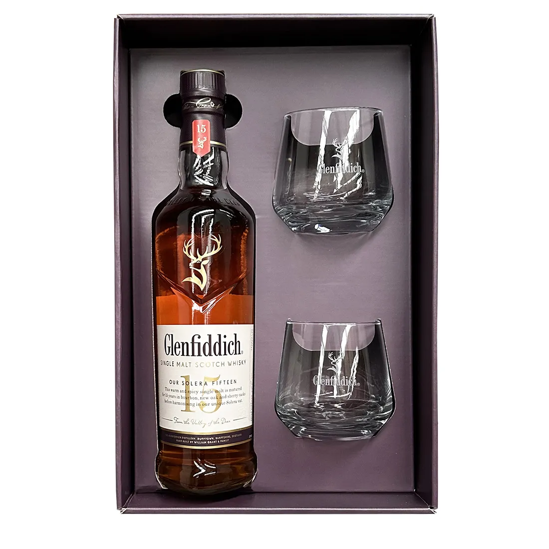 A Limited Edition Gift Pack from Glenfiddich including a bottle of 700ml Glenfiddich 15 Year Old Solera Fifteen Single Malt Whisky and 2 Glenfiddich branded whisky glasses.