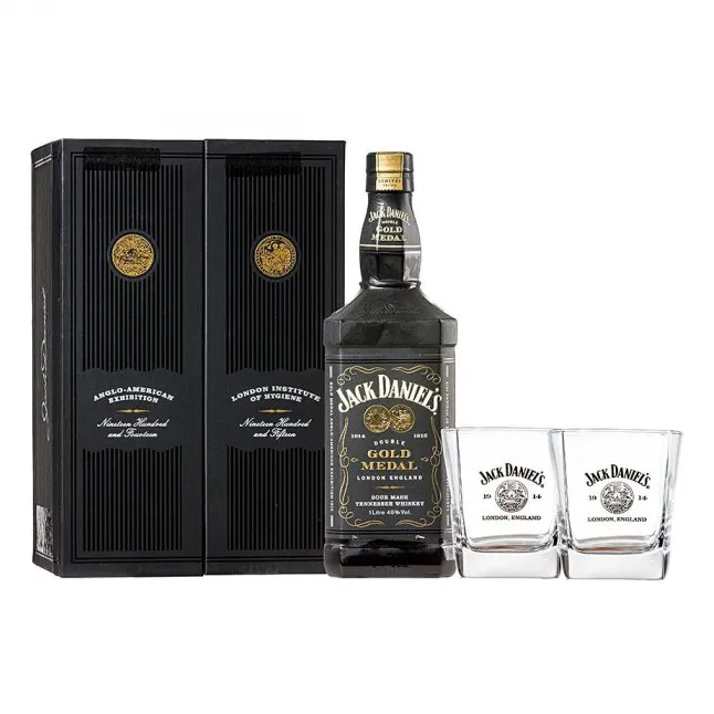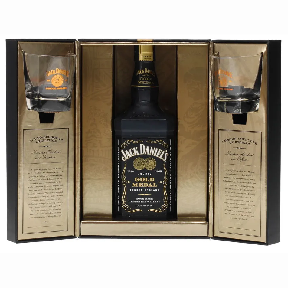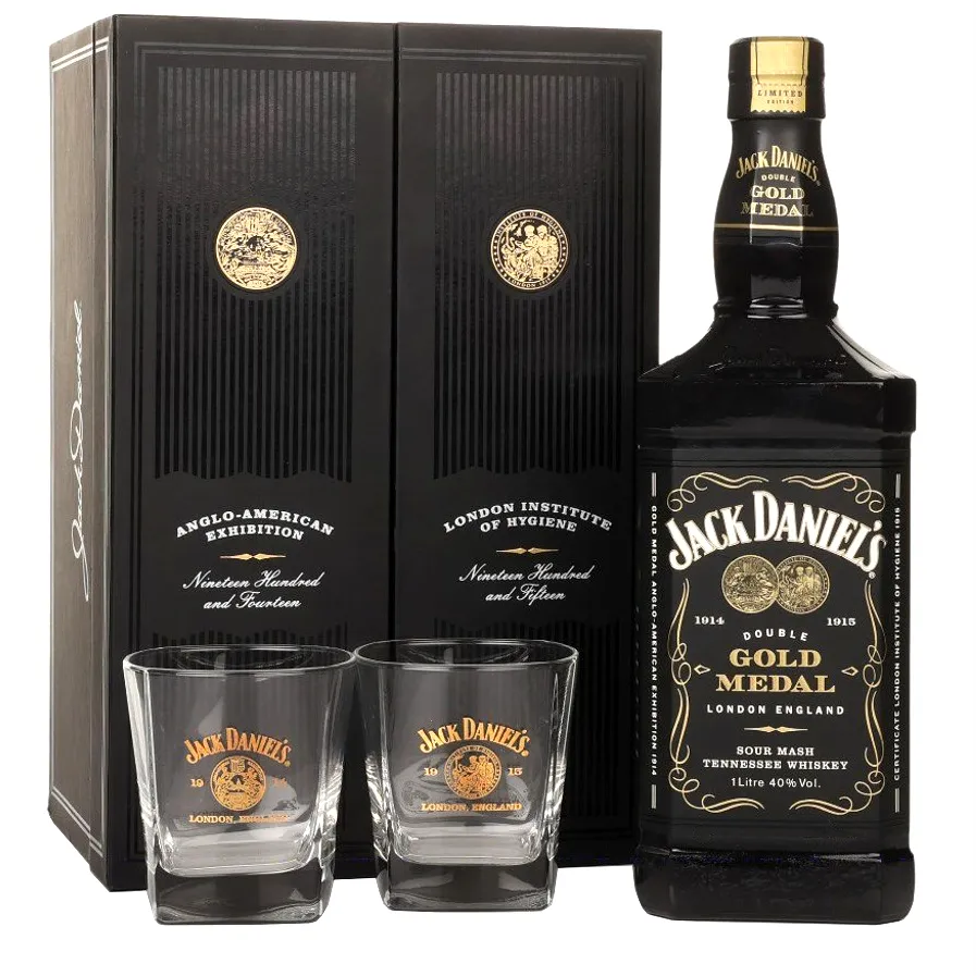 Jack Daniel’s Double Gold Medal 1914-1915 Gift Set including Sour Mash Tennessee Whiskey 1L and two branded tumblers. This Limited Edition Gift Set was released in honour of Jack Daniel's being awarded two gold medals in 1914 and 1915 from the Anglo-American Exhibition and Institute of Hygiene. It was released just before the start of 2012 Olympics as a travel retail exclusive in London airports.