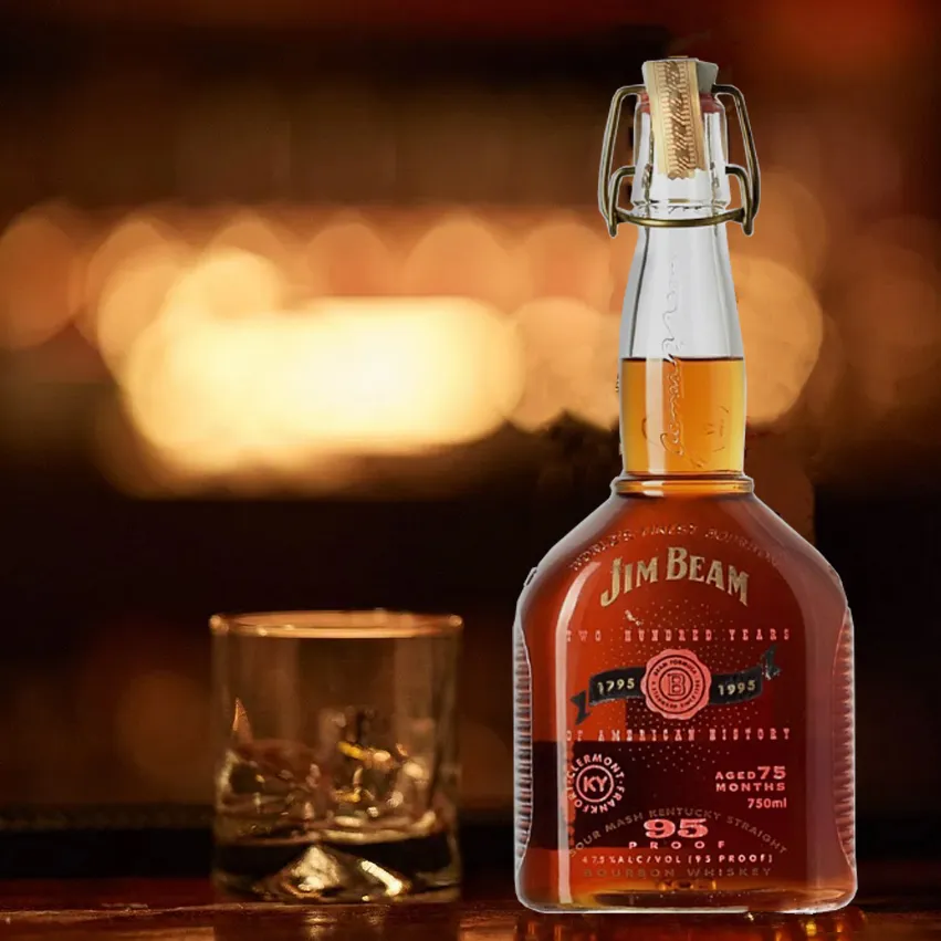 Jim Beam 200 Year Anniversary 1795-1995 Limited Edition Whiskey. This commemorative bottle of Jim Beam Sour Mash Kentucky Straight Bourbon Whiskey celebrates two hundred years of American history. This special bottle was released in 1995 marking the 200th anniversary of Jim Beam Kentucky Bourbon Whiskey. The whiskey was aged for 75 months and bottled at 95 Proof.
