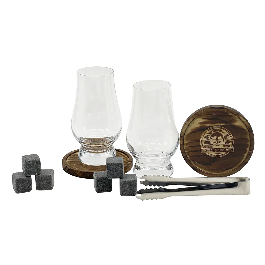 Jim Beam Black 7 Year Old Kentucky Straight Bourbon Whisky with gift box including 2 glasses, 2 wooden coasters with Skull & Barrel logo and 6 stone ice cubes.