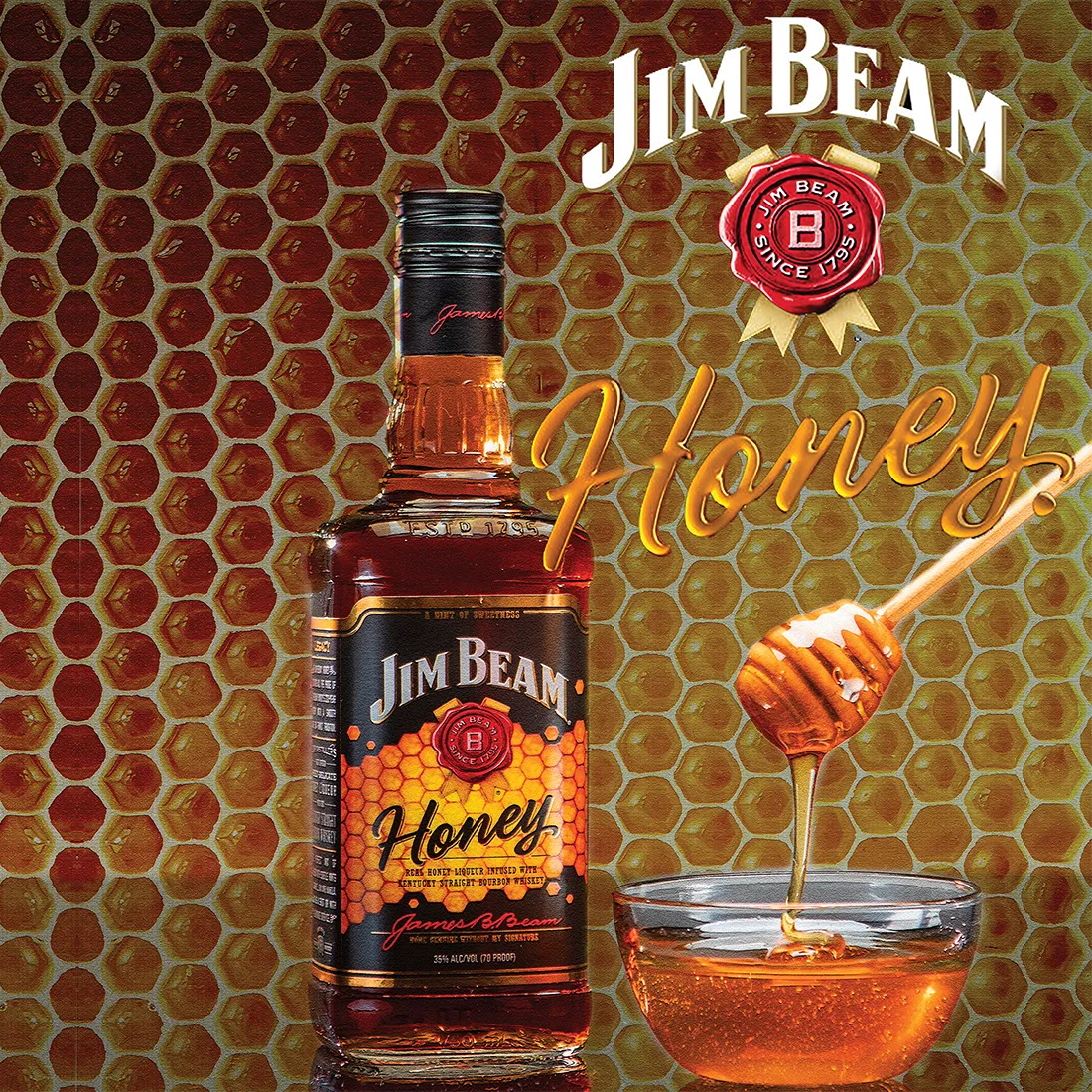Jim Beam Honey is a delicious combination of real honey liqueur and genuine Jim Beam Kentucky Straight Bourbon Whiskey. Sweet but not too sweet, Jim Beam Honey has the perfect touch of golden honey to allow its sweetness to shine without losing the mellow and smooth taste like Jim Beam’s original bourbon.