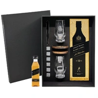 Johnnie Walker 12 Year Old Black Label 2025 release with gift box including 2 whisky glasses, 2 wooden coasters and 6 stone ice cubes. Also included a Johnnie Walker Black Label miniature 50ml bottle.