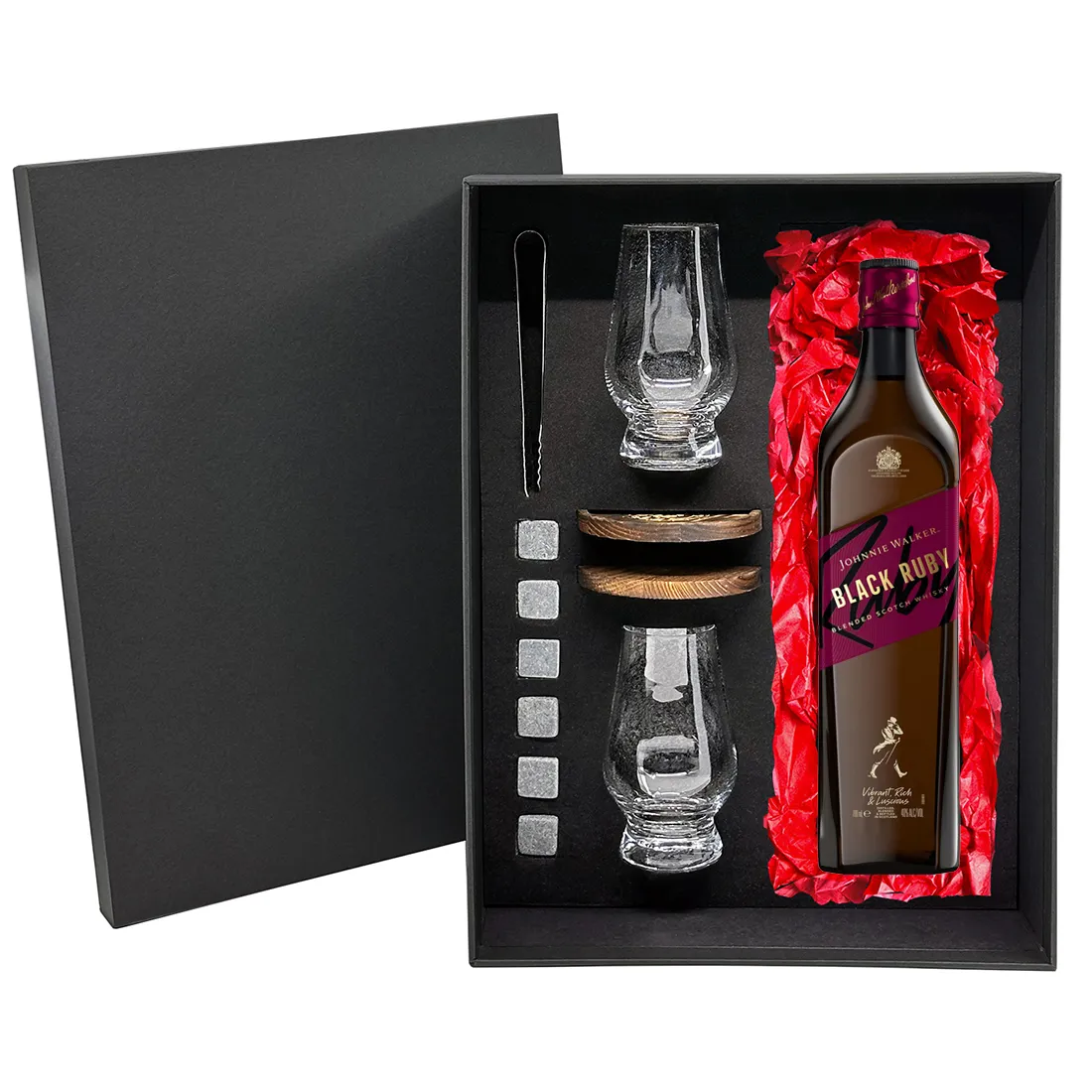 Johnnie Walker Black Ruby with gift box including 2 glasses, 2 wooden coasters with Skull & Barrel logo and 6 stone ice cubes.