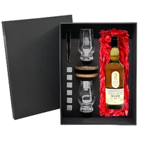Lagavulin 11 Year Old Offerman Edition 3 with gift box including 2 glasses, 2 wooden coasters with Skull & Barrel logo and 6 stone ice cubes.
