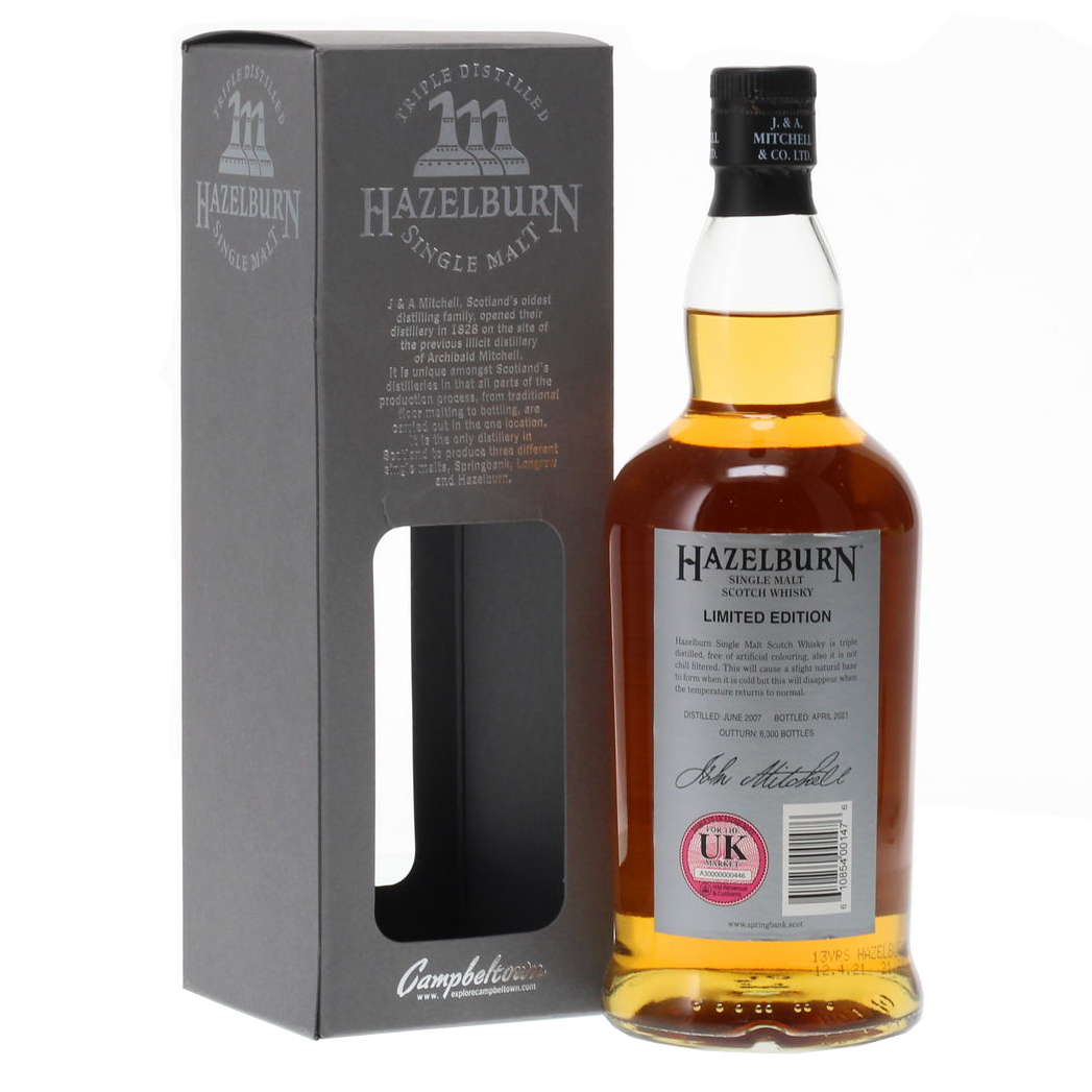 Part of the Hazelburn core range, this is a 13 Year Old bottling of Hazelburn Single Malt from the Springbank distillery. It was distilled in June 2007 and bottled in April 2021. This is one of only 6300 bottles produced.