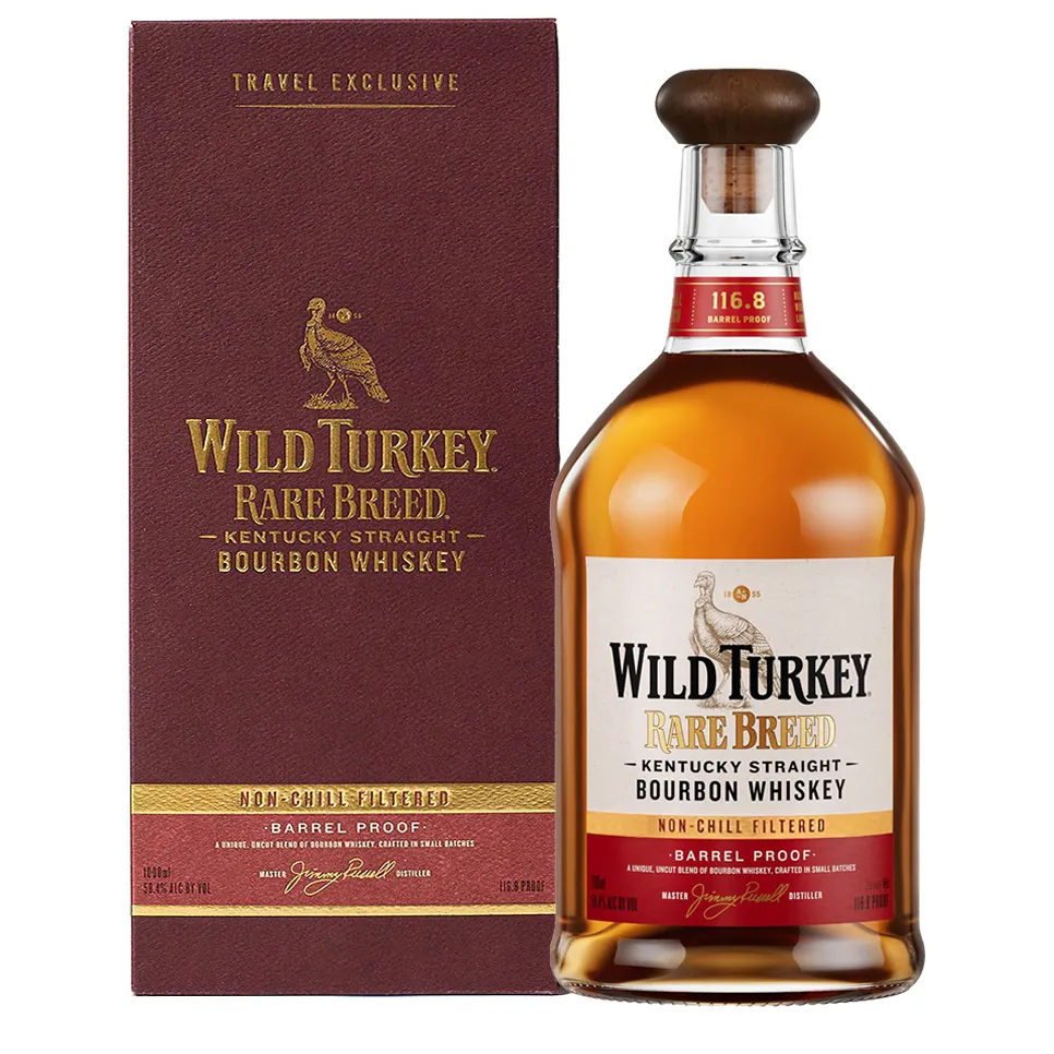 Wild Turkey Rare Breed Kentucky Straight Bourbon Whiskey is barrel proof (bottled at cask strength) non-chill filtered version, a Travel Exclusive release.